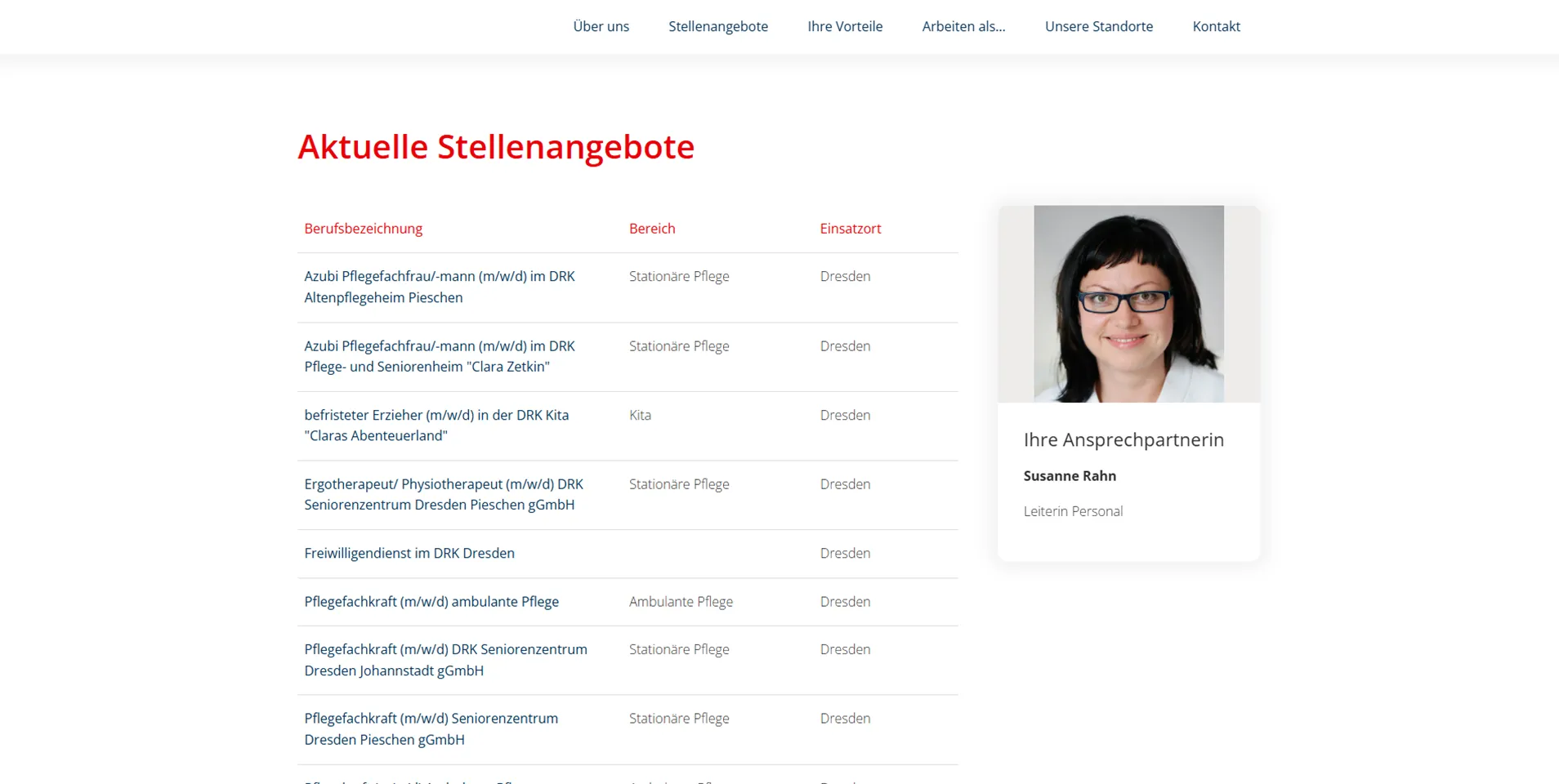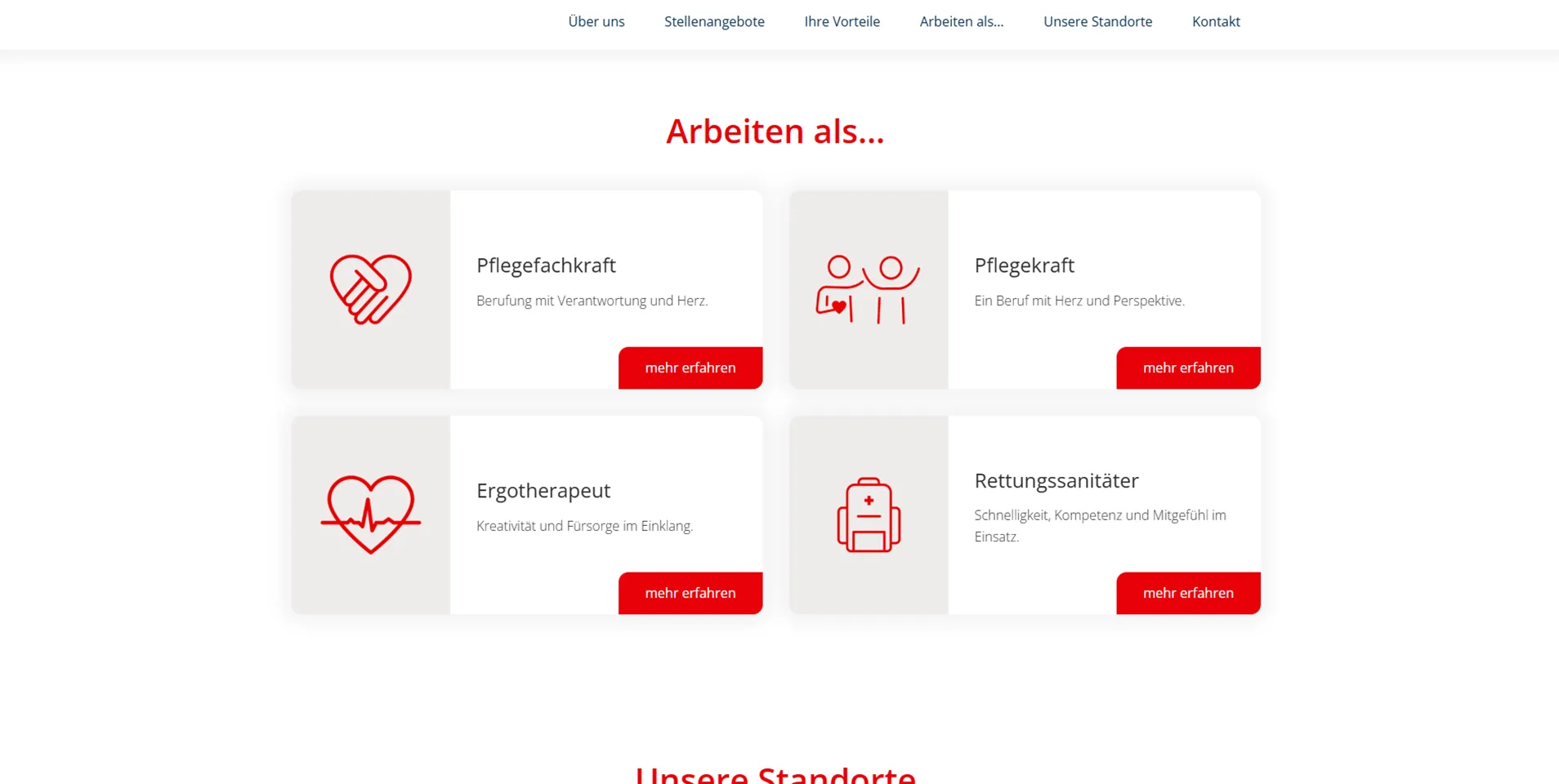 Auf dem neuen Onepager sollten nicht nur die aktuellen Stellenangebote ausgegeben, sondern die Besonderheiten des DRK hervorgehoben werden. Zusätzlich sollten die Berufsbilder und Standorte einen Platz auf der neuen Webseite finden.