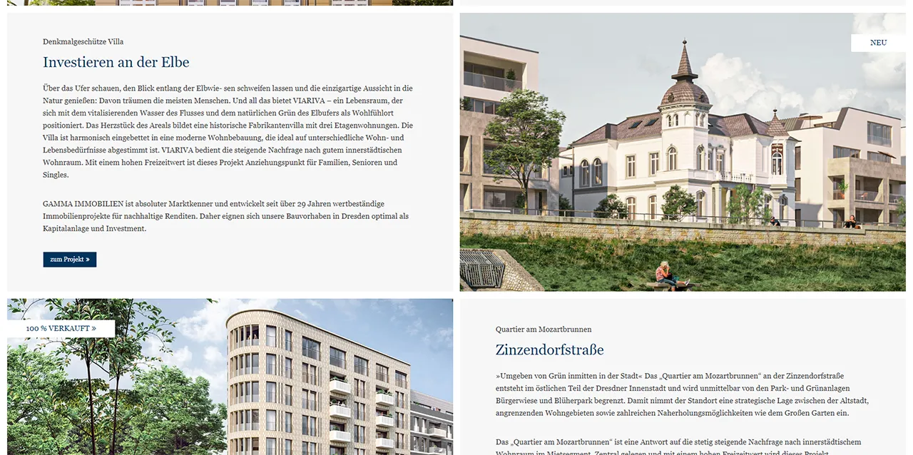 Für die Darstellung der verschiedenen Projekte im Verkauf, der Vermietung oder den Referenzen wurden flexibel nutzbare Inhaltselemente hinterlegt. Dadurch konnten die Bereiche einheitlich gepflegt werden und dennoch auf die Besonderheiten, auch die der einzelnen Projekte, eingegangen werden. Jedes Projekt verfügt darüber hinaus über eine eigenständige Unterseite mit Landingpage-Charakter.