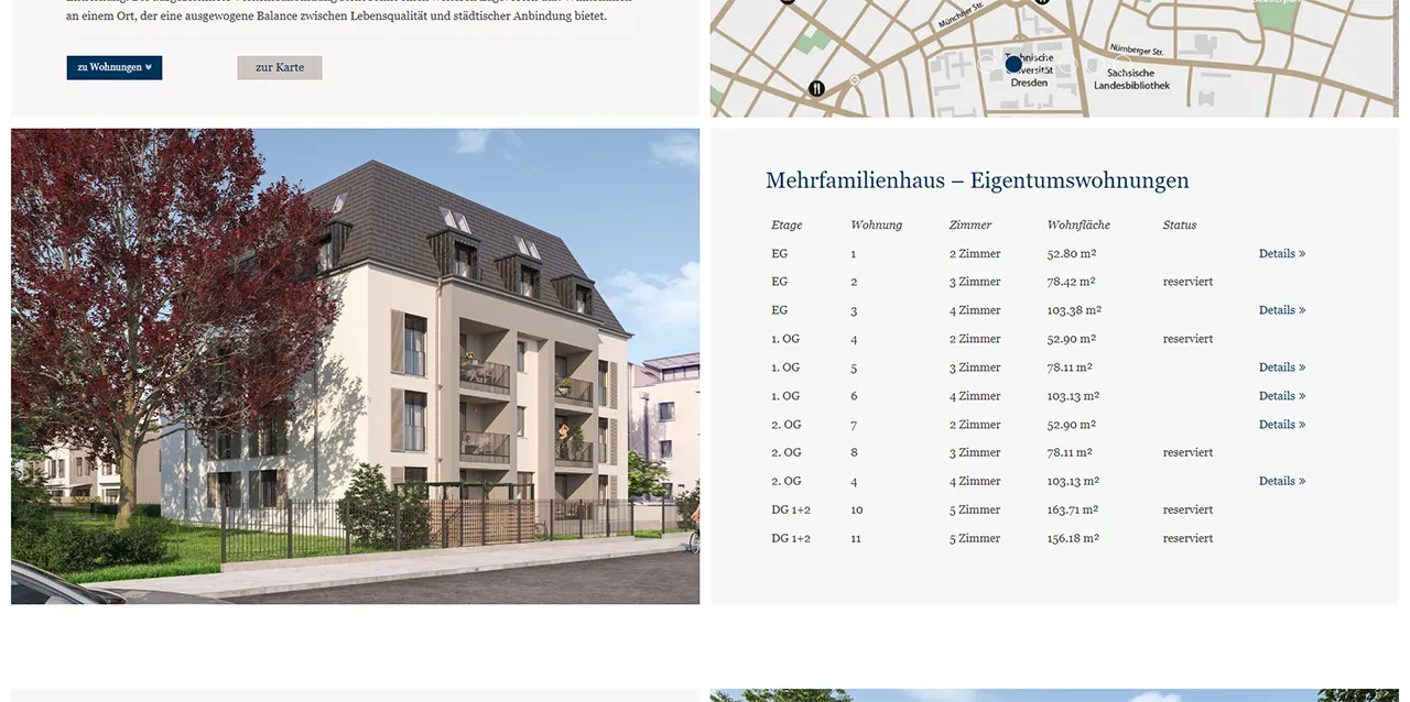 Neben den allgemeinen, relevanten Informationen zu jedem Projekt wurden auf den Detailseiten auch Wohnungsübersichten angelegt. Diese ermöglichen einen einfachen Überblick über verfügbare Wohnungen in einem Objekt. Bei Interesse können Detailinformationen zu den Wohnungen aufgerufen und eine entsprechende Anfrage gestellt werden.