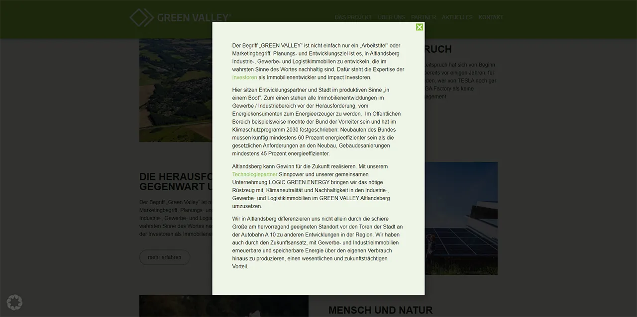 Um den Onepager optisch nicht zu überladen, aber dennoch weiterführende Informationen hinterlegen zu können, wurden neben Slidern auch flexible Layer integriert. Diese öffnen sich bei einem Button-Klick und geben dem Nutzer weiterführende Informationen an die Hand.