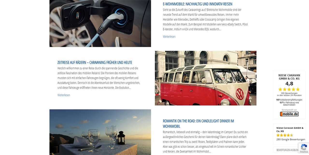 Unsere Leistungen bei Niese Caravan:Beratung . SEO . Individuelles Webdesign . WordPress Webenticklung . Contentmarketing . Strategieberatung . Kampagnenplanung . Digitalisierung . Google Ads . Social Media Marketing