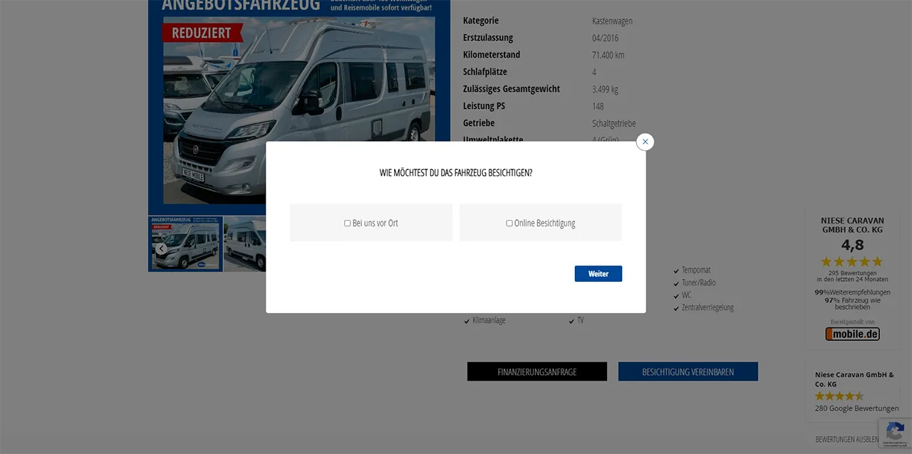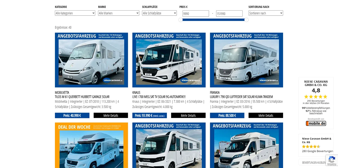 Für unseren langjährigen Kunden Niese Caravan sollte nicht nur eine neue Homepage geschaffen werden, die optisch im Zeichen der Zeit steht. Vielmehr sollte ein automatischer Abgleich mit dem Fahrzeugbestand von mobile.de geschaffen werden und die Integration von direkten Leadmöglichkeiten zu den Fahrzeugen. Weiterhin war für die Seite eine große Flexibilität Voraussetzung, um die Erstellung von thematischen Landingpages zu ermöglichen. Da die Seite nicht nur für Webseitenbesucher gedacht war, sondern auch in abgewandelter Form auf den Bildschirmen vor Ort für die Kunden sichtbar sein sollte, musste eine „zwei in eins“ Lösung geschaffen werden.