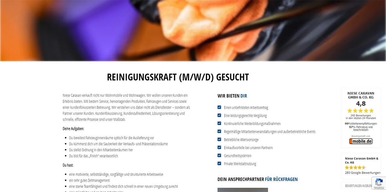 Um trotz des Fachkräftemangels den Personalbedarf bei Niese Caravan zu decken, wurde ein ausführlicher Jobbereich in die Webseite integriert. Dieser stellt nicht nur die einzelnen Ausschreibungen zur Verfügung, sondern gibt auch Einblicke in die Arbeit beim Kunden wieder. Abgerundet wird die Jobsektion um eine Onlinebewerbung und die Darstellung der Vorzüge. Der Jobbereich und die einzelnen Ausschreibungen dienen als Landingpages für die verschiedenen Online-Recruiting-Maßnahmen (Jobportale, Social Ads, Google Ads usw.).