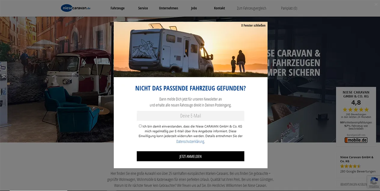 Um die Nutzer, die kein passendes Fahrzeug gefunden haben, weiter an das Unternehmen zu binden, wurde ein Newslettersystem integriert. Über den Versand können wir die Kontakte regelmäßig mit den aktuellen Fahrzeugen versorgen, bis sie ihr Wunschfahrzeug gefunden haben. Beworben wird der Newsletter über die seitenweite Teaser-Integration und ein Exit-Intent-Popup (dieses öffnet sich, sobald der Besucher Anzeichen zeigt, die Webseite verlassen zu wollen). Mit diesem System wurde ein kosteneffizientes Marketingmittel etabliert, das sich bereits kurz nach dem Start als zuverlässiger Vertriebskanal erwiesen hat.