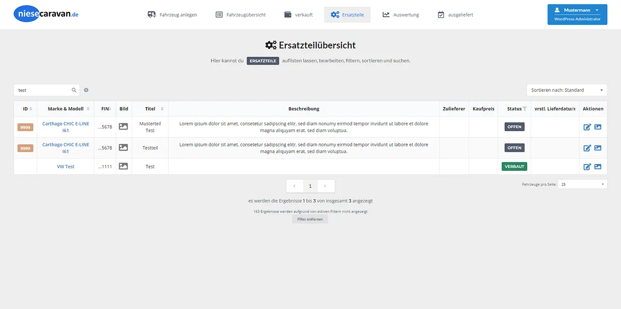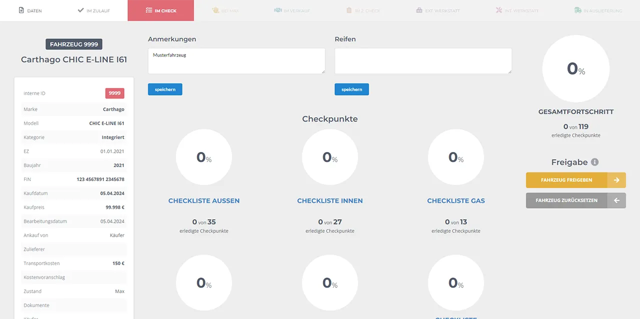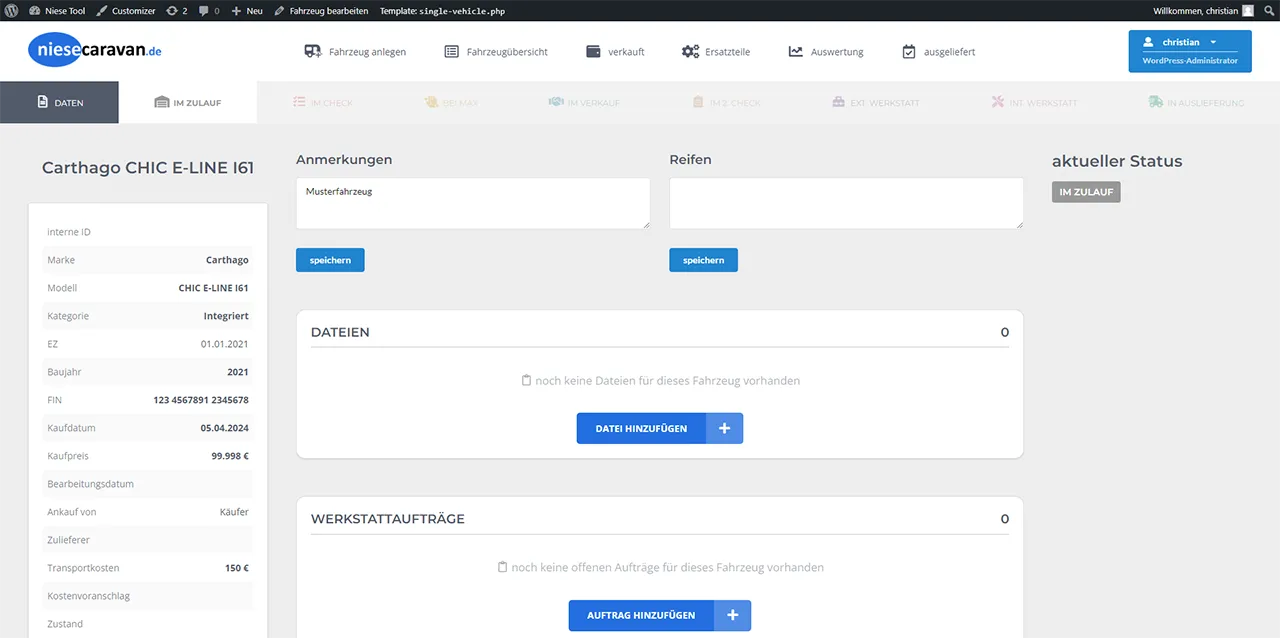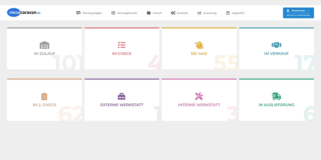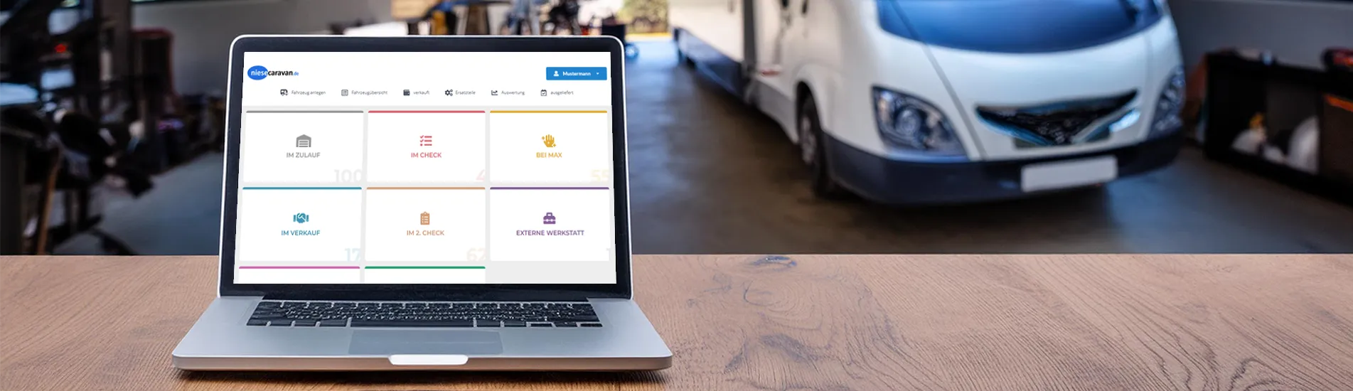 Für Niese Caravan war es nicht nur unsere Aufgabe, das Onlinemarketing voranzutreiben und die Prozessstrukturen im Unternehmen zu optimieren. Ferner galt es auch, mit einer individuellen Lösung die neuen Prozesse zu digitalisieren. Hierfür wurde für den Kunden ein eigenes Tool gestaltet, das den kompletten Inhouse-Lebenszyklus eines Fahrzeugs abbildet.