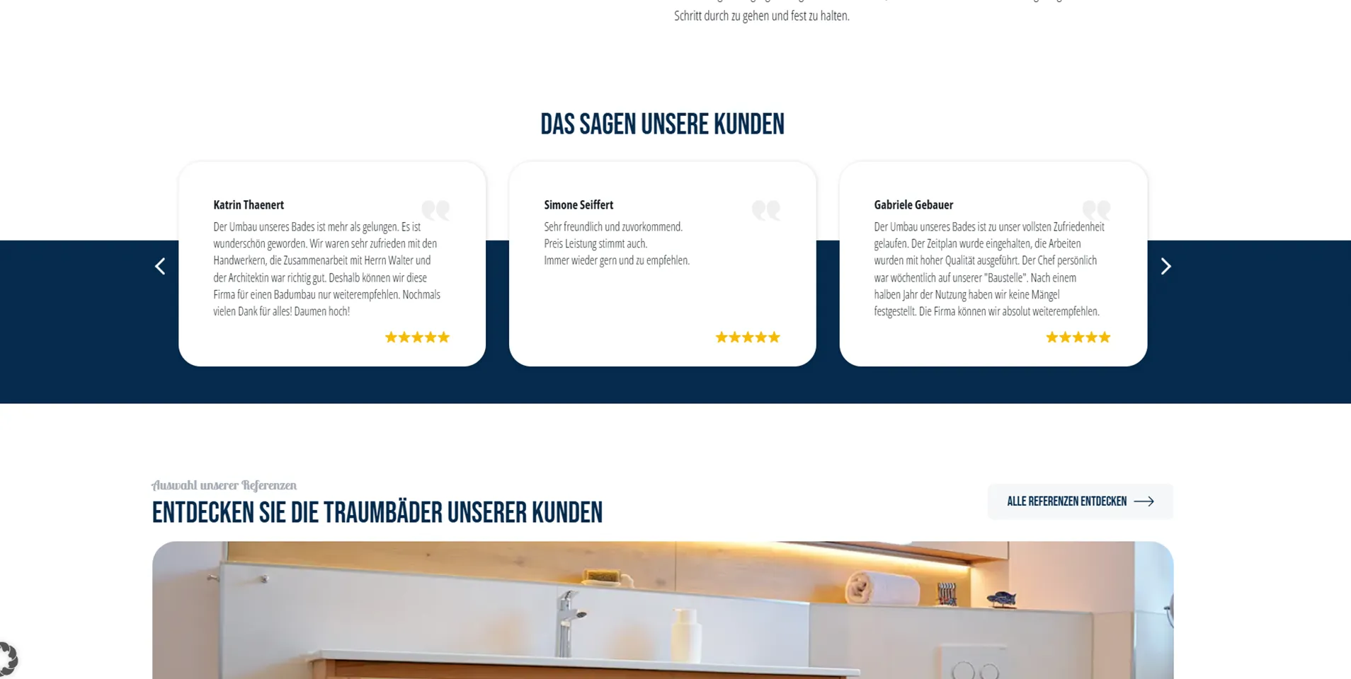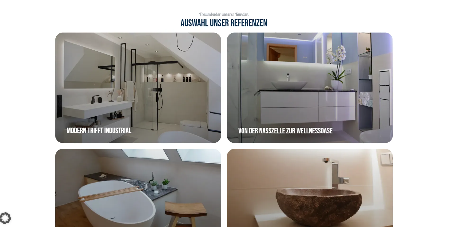 Als Herzstück der Seite fungieren die Referenzbäder. Hierfür wurden nicht nur Einzelseiten für die Referenzen und eine Übersichtsseite geschaffen. Auf jeder Unterseite können nun einzelne oder mehrere Referenzen flexibel ausgegeben werden. Dadurch werden diese Beispiele der geleisteten Arbeiten nicht nur sichtbarer, sondern können auch thematisch passend zum Thema der Unterseite ausgewählt werden.